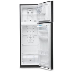 Refrigerador tipo top‑mount (congelador superior) con capacidad promedio (10 pies cúbicos, aproximadamente 250 L). Destaca por su diseño moderno en tono grafito o black mate, jaladeras tipo pocket, y características de comodidad como despachador de agua y eficiente sistema de enfriamiento.